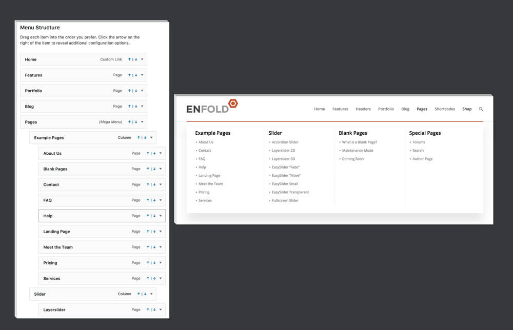 If you got a big site with lots of sub menus we recommend using a mega menu. The feature is built right into the default WordPress Menu Builder and works without any extra effort.